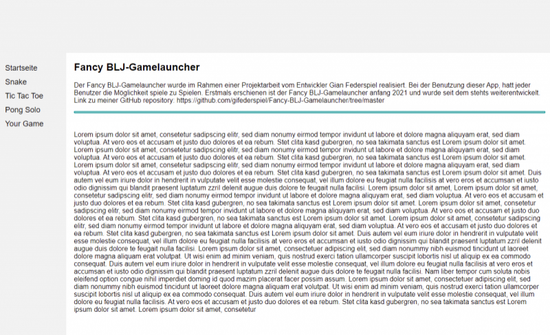 Meine Lösung besteht aus zwei Blöcken. Der Electron-Block und die Spieldateien. Meine Electron-App besteht aus mehreren HTML, CSS und JavaScript seiten, die ich selbst, oder mit Hilfe von Youtubevideos und Foren erarbeitet habe. Die Spiele habe ich in Python programmiert. Es sind drei Spiele an der Zahl (Snake, Tic-Tac-Toe und Pong). In der App gibt es auch ein Formular, wo man eigene Spiele einsenden kann. Die Spiele werden dann aufgelistet.