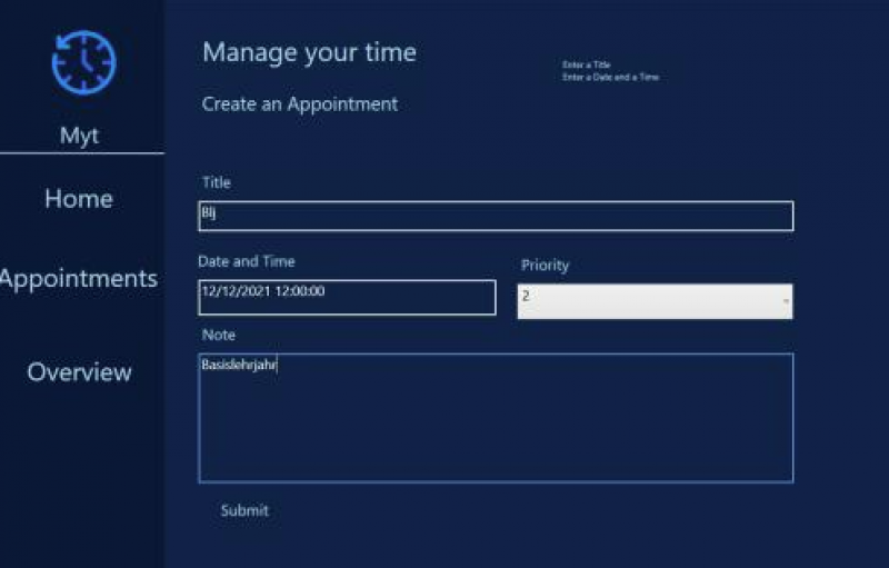 Mein Porjekt ist ein Zeit Manager. Mann soll Termine eintragen können, bearbeiten und Löschen.