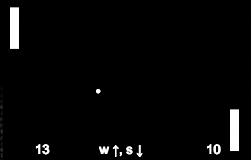 Ich habe ein Spielfeld mit einem Paddle (Schläger) und einem Ball gemacht. Der Ball prallt an allen Wänden ab, nur an der eigenen nicht, damit der Gegenspieler, in diesem Fall die Wand auch Punkte machen kann. Den Schläger kann man mit den Tasten "W" und "S" nach oben und nach unten bewegen.