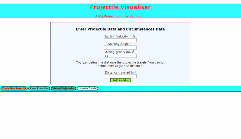 Ich wollte eine Webseite erstellen, auf welcher man die Flugbahn eines Projektils berechnen und visualisieren konnte. Ich hatte bisher noch nie mit Javascript gearbeitet und wollte es lernen. Das Ziel war besser in Javascript zu werden und eine Webseite zu erstellen die eine Projektil-Flugbahn (in einem Vakuum) berechnen und visualisieren kann. Ich setzte nicht viel Wert auf das Styling der Webseite. Ich wollte sie simpel halten und lieber auf das Javascript fokusieren.