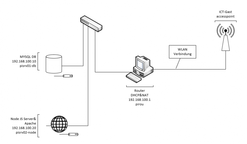 Im Netzwerk sind drei Raspberry Pis, die unterschiedliche Aufgaben erfüllen. Ein Pi ist der Master und fungiert als DHCP und Router, auf dem zweiten läuft der Node.js Server und ein Apache für das HTML und auf dem dritten befindet sich der MySQL Server. Nun kann man die Webseite anschauen, indem man sich mit diesem Netzwerk verbindet. Das Verbinden funktioniert zurzeit aber nur per LAN-Kabel.