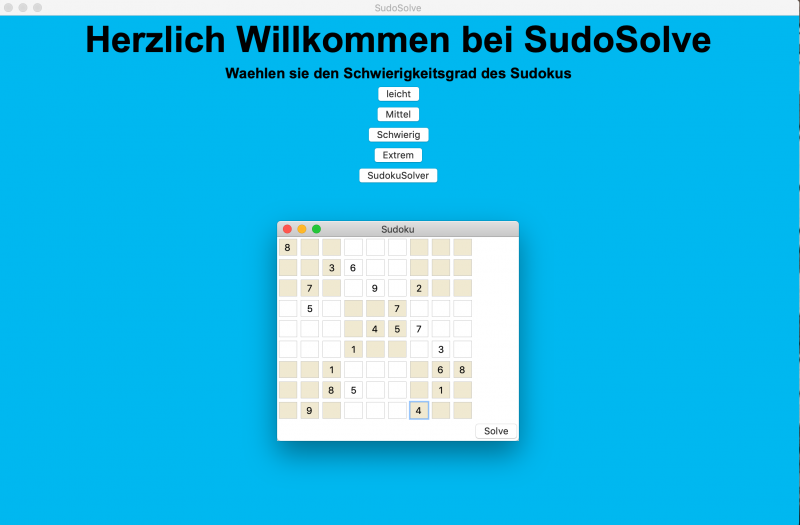 Ein Problem war es, die eingegebenen Zahlen des Benutzers mit der Lösung zu vergleichen. Zudem habe ich die Schwierigkeit des SudokuSolvers unterschätzt. Darum hatte ich am Ende des Projektes ein wenig Zeitruck mit der Fertigstellung.